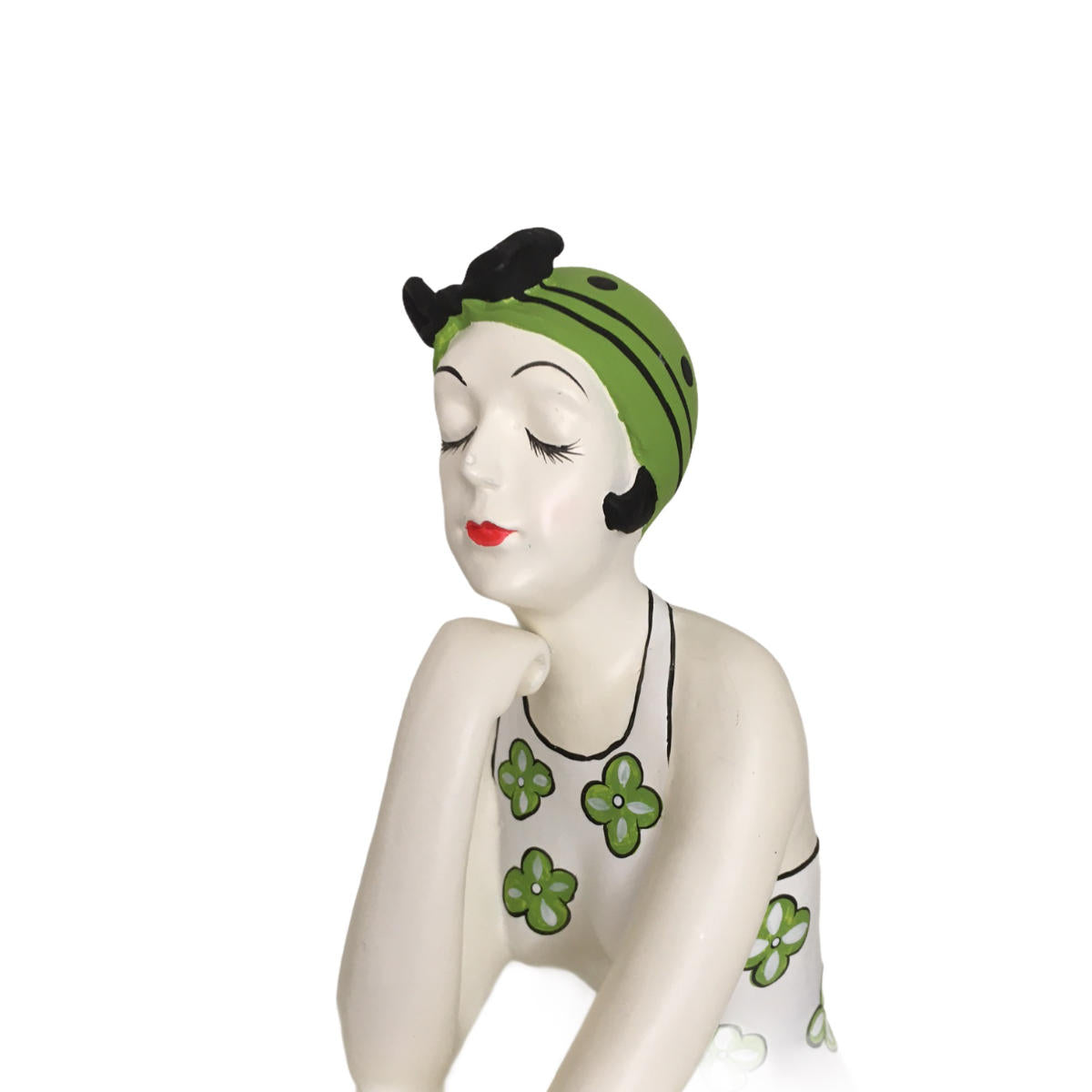 Badenixe auf einem Ball sitzend, gross - trägt einen weiss-grünen Badeanzug