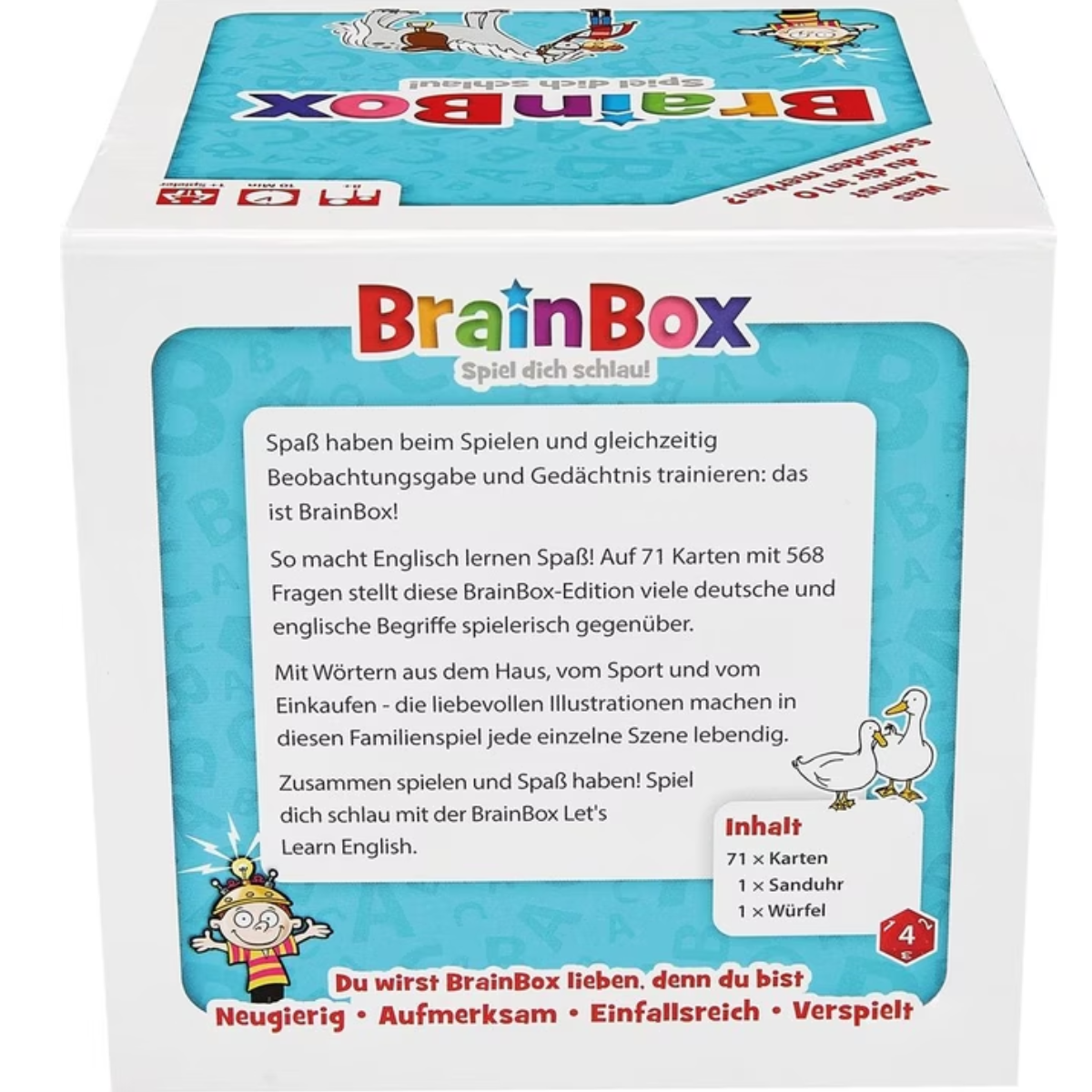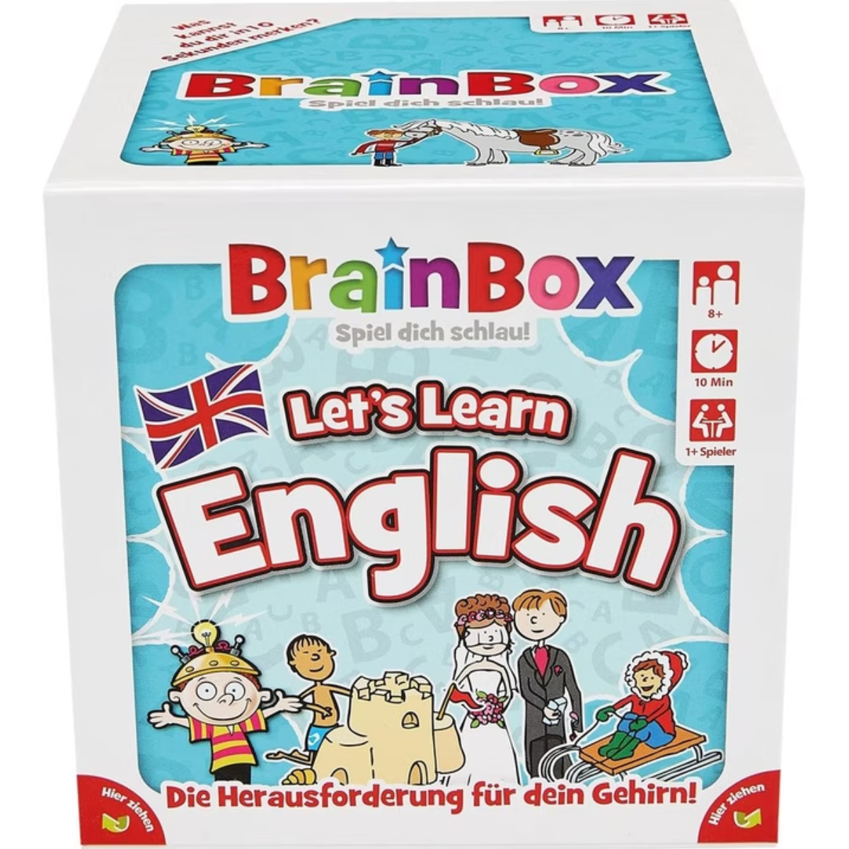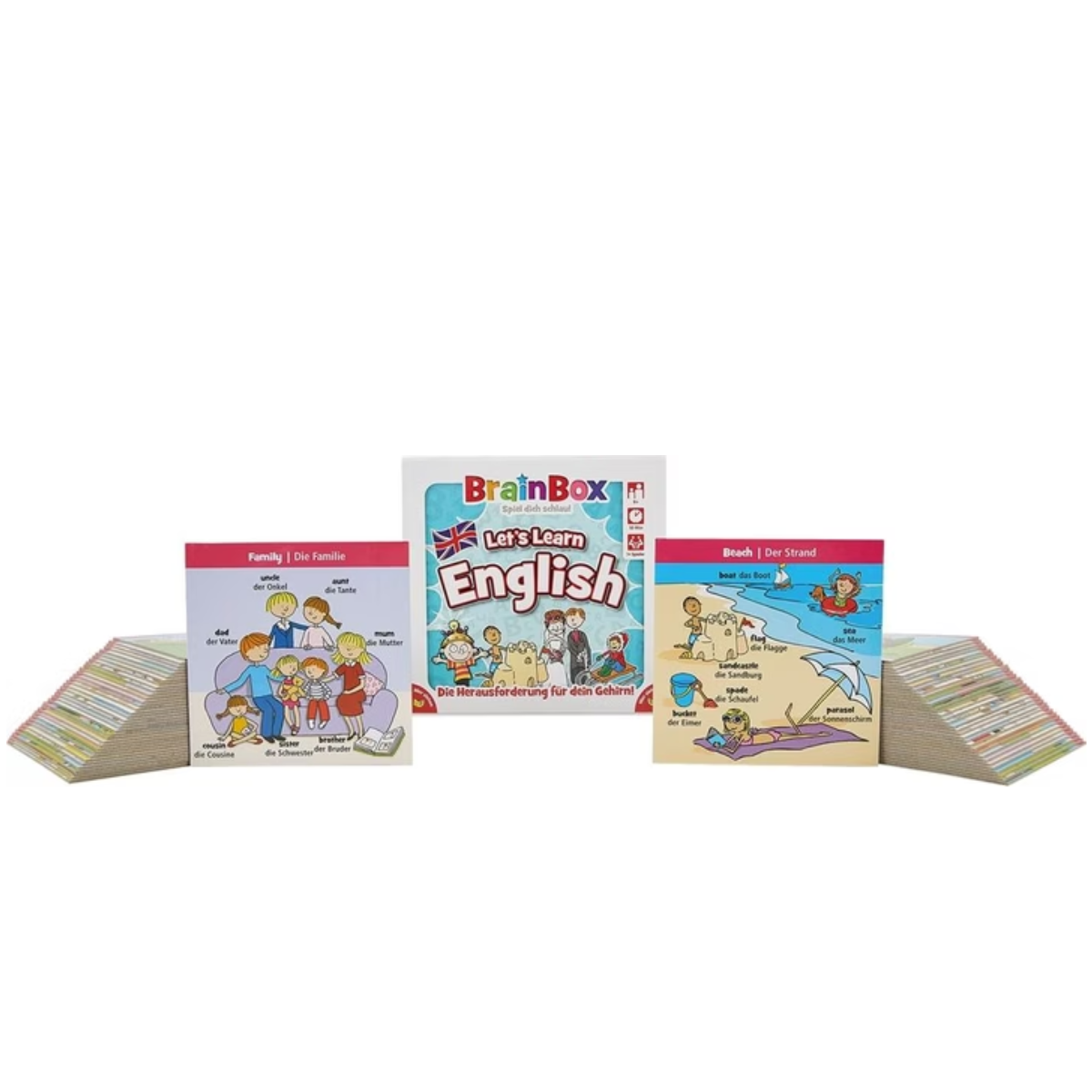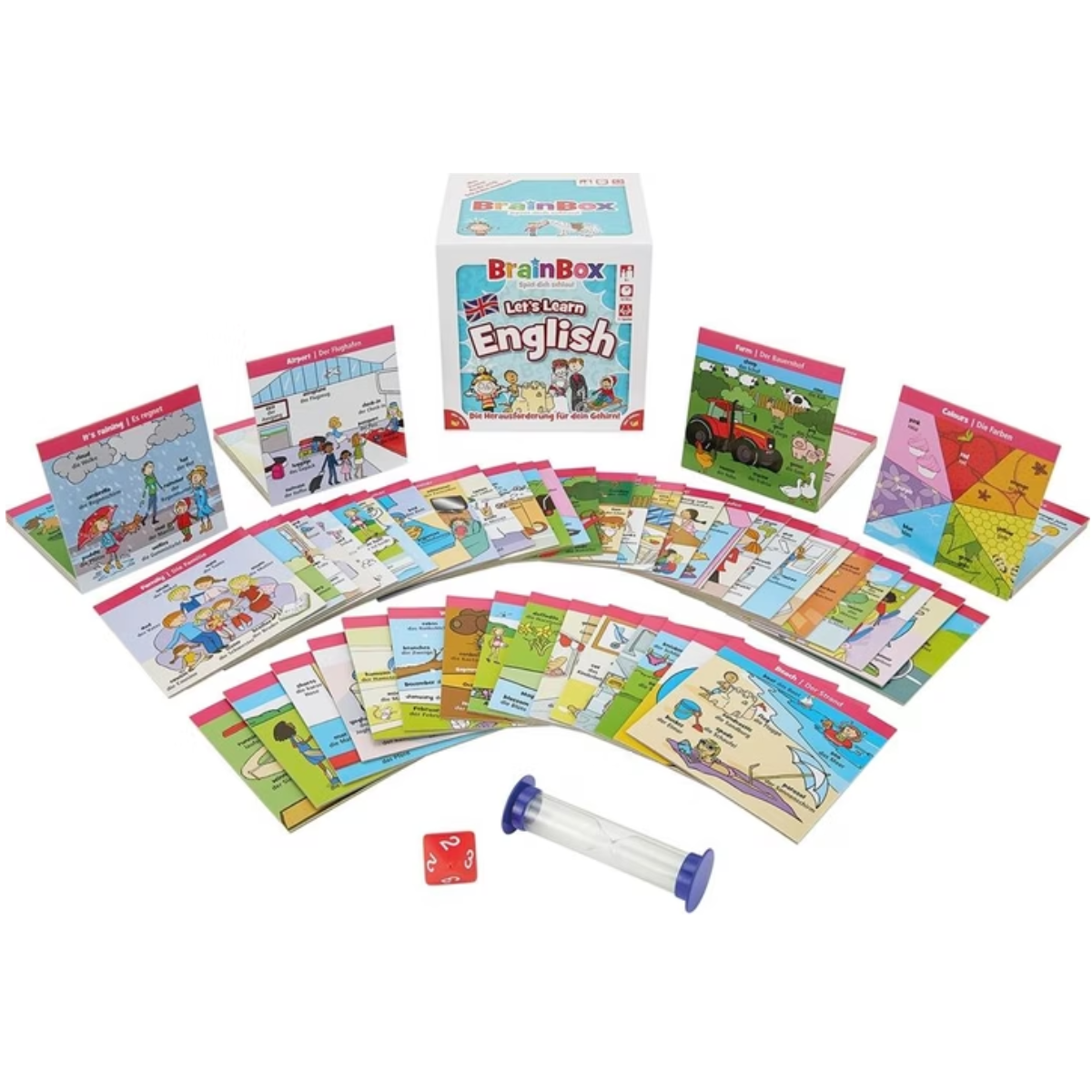 BrainBox – Learn English ist ein unterhaltsames Lern- und Gedächtnisspiel für Kinder ab 7 Jahren, das spielerisch den Englisch-Wortschatz und das Sprachverständnis fördert. In jeder Runde haben die Spieler kurze Zeit, eine Karte mit Wörtern, Bildern, Zahlen oder einfachen Sätzen einzuprägen. Anschliessend beantworten sie Fragen, die sich auf die Inhalte der Karte beziehen.