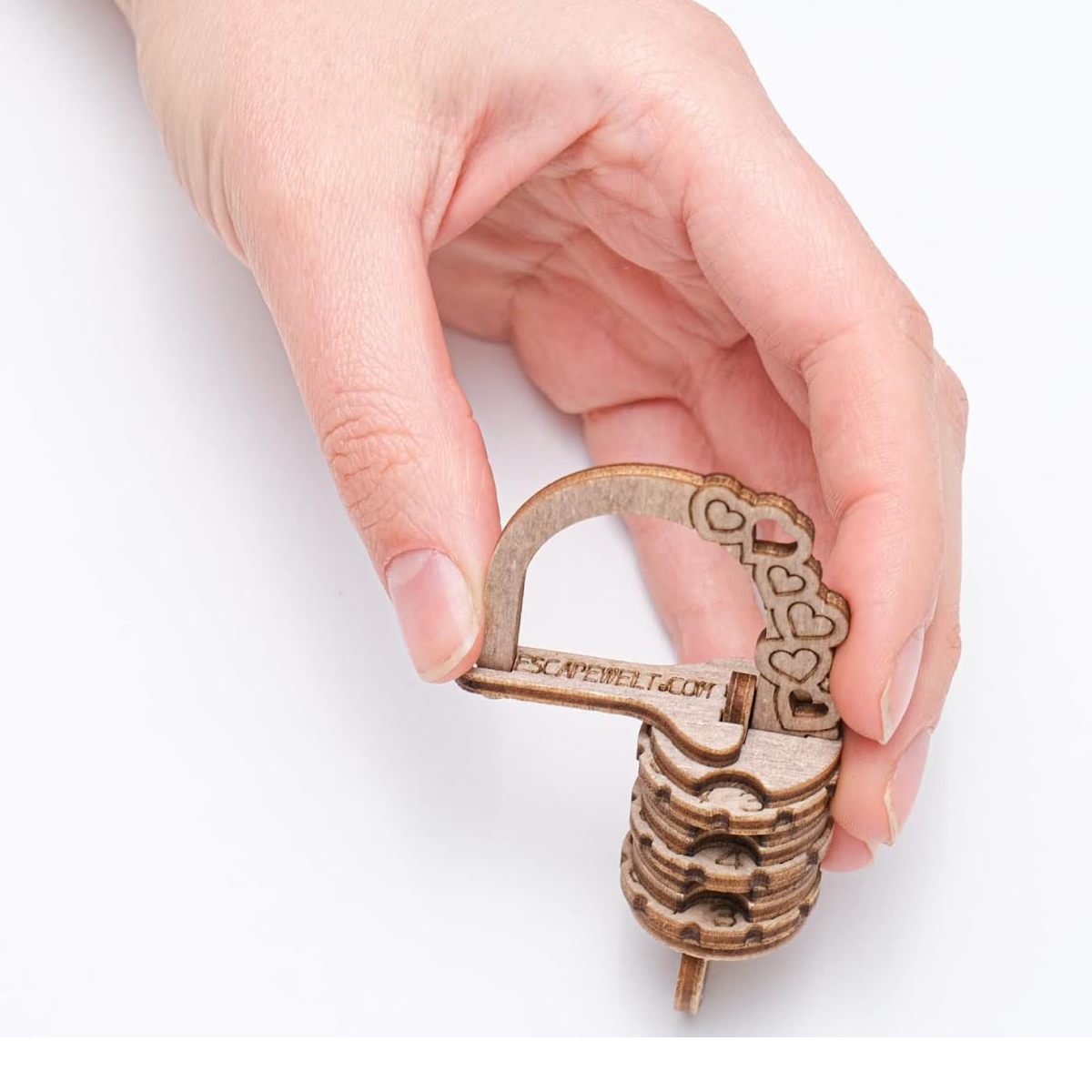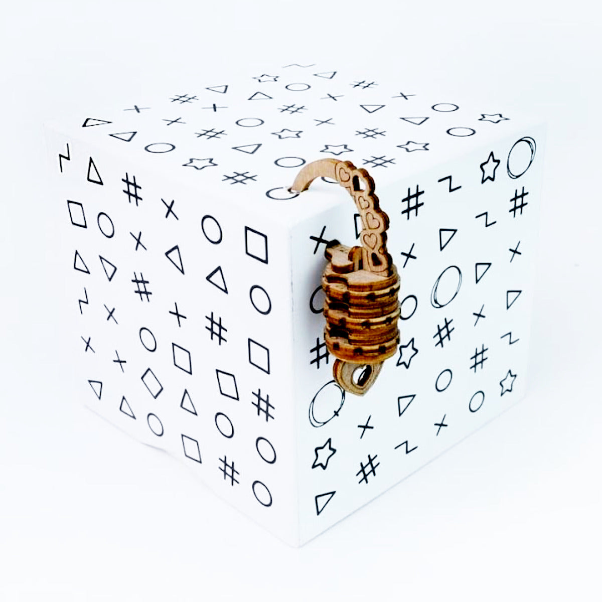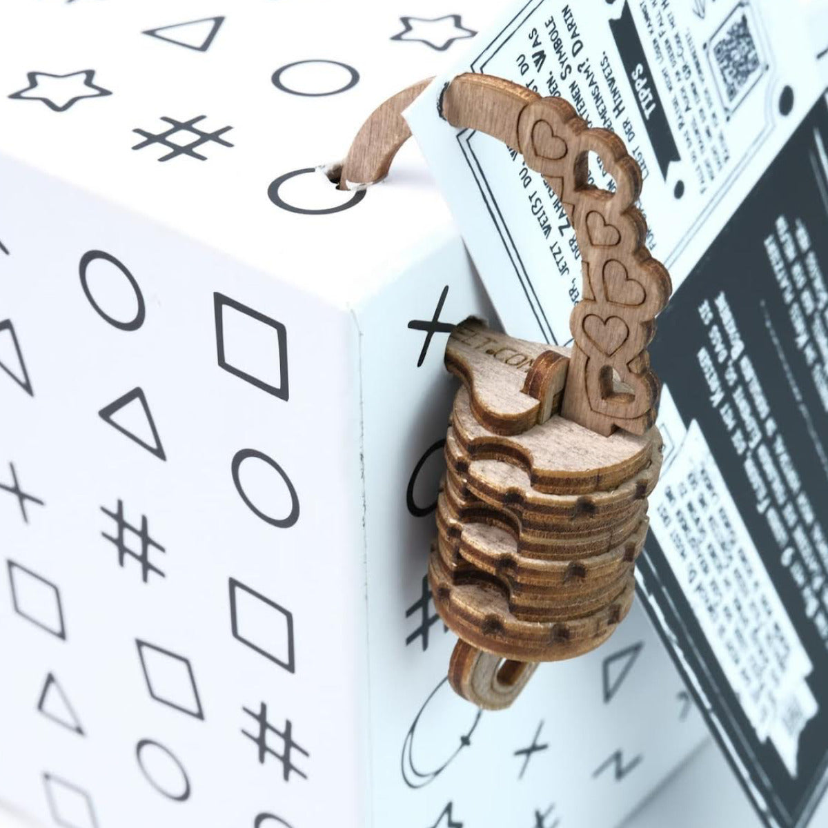 Die Schachtel besteht aus festem Karton und ist mit einem ausgeklügelten Holzschloss gesichert, dessen Code vom Empfänger entschlüsselt werden muss. So wird das Auspacken zu einem Erlebnis, das in Erinnerung bleibt.