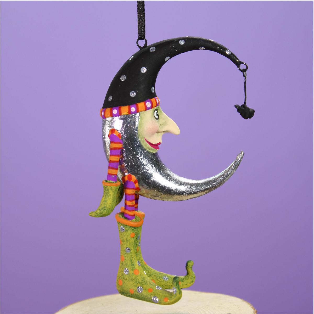 Das Fledermaus Mond Ornament blickt auf eine winzige Fledermaus, die an der Spitze seines schwarzen Mondhutes hängt. Halloween ist definitiv sein Feiertag! Er leuchtet in Blattsilber und trägt grüne Stiefel und Handschuhe.