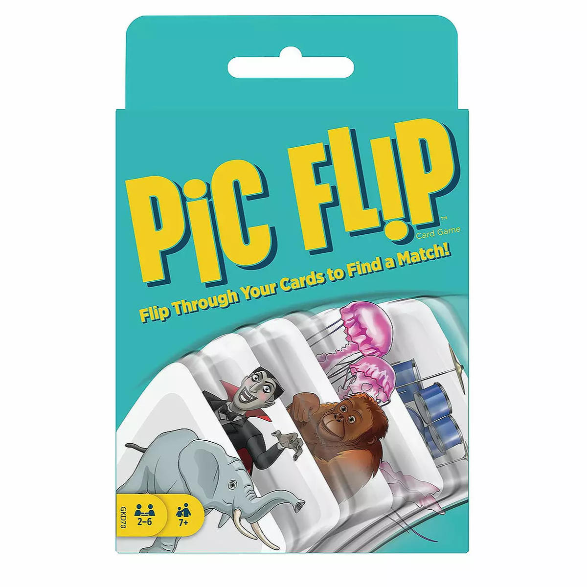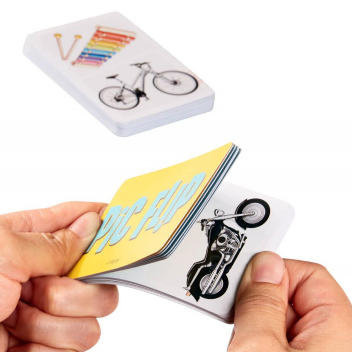 Pic Flip ist ein rasantes Kartenspiel, bei dem Bilder erwählt und Karten so schnell wie möglich überflogen werden müssen. Die Spieler/Spielerinnen blättern die Karten durch, um passende Bilder zu finden und schließlich alle loszuwerden. Wenn eine passende Karte gefunden wurde, wird sie abgelegt und es wird sofort ein neues Bild ausgerufen, dann beginnt die Suche erneut.