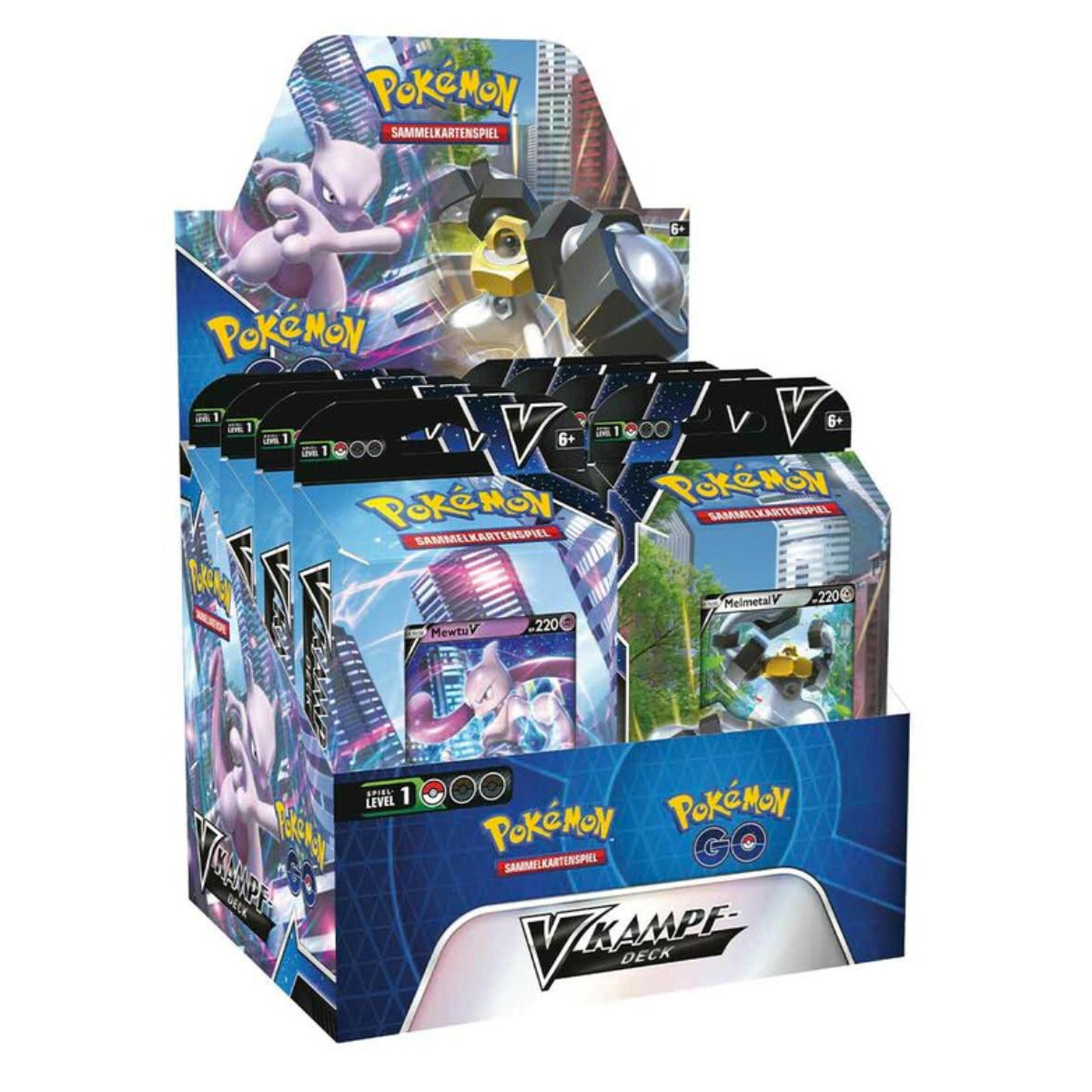 Entfessle mit den V-Kampfdecks Pokémon GO des Pokémon-Sammelkartenspiels mächtige Energie oder stahlharte Treffer mit einem Deck, das von Melmetal-V oder Mewtu-V angeführt wird! Mewtu-V steht an der Spitze eines unfassbaren Teams von Psycho-Pokémon und Melmetal-V liefert die vernichtende Kraft von Metall-Pokémon. Lande Runde für Runde schnelle Treffer, halte Energie im Spiel und meistere alle Tricks dieser beiden V-Kampfdecks!