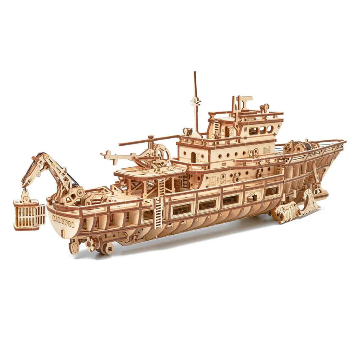 Das Forschungsschiff ist ein Holzmodell von Wood Trick, das perfekt für Fans von Schiffen ist. Inspiriert wurde es von der Yacht Calypso, die dem berühmten Jacques-Yves Cousteau gehörte. Der Meeresforscher und Erfinder drehte Dutzende von Filmen über die Unterwasserwelt, entwickelte die erste Tauchflasche und trug massgeblich zur Erforschung der Meerestiefen bei.