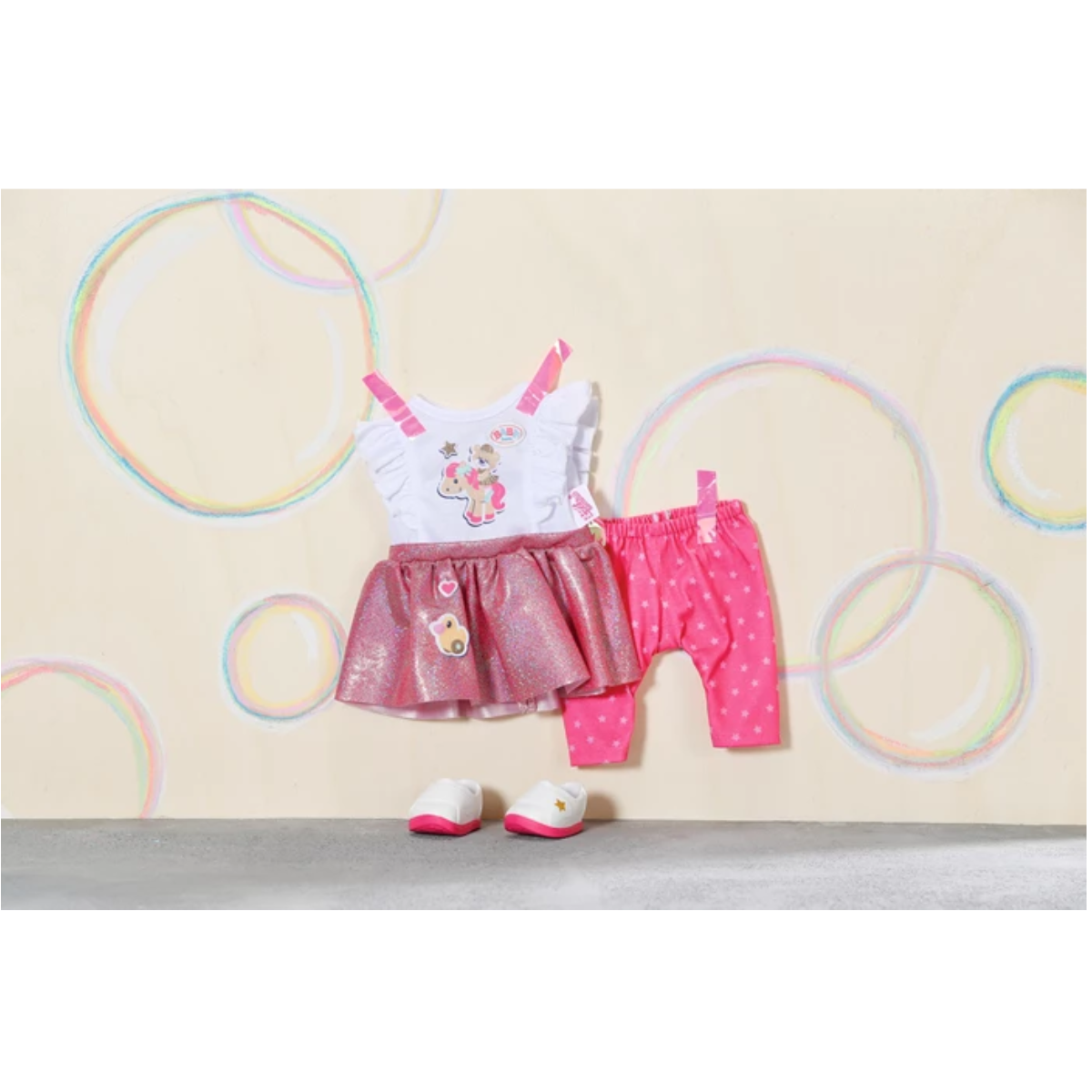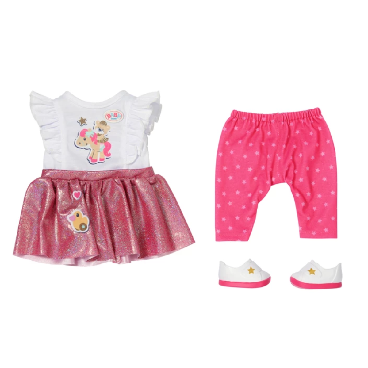 Nichts zum Anziehen? Nicht mit dem Everyday Outfit für BABY born Little 36 cm. Das Oberteil kann sowohl als Shirt mit der pinken Leggins mit Sternen-Print kombiniert, als auch allein als Kleidchen getragen werden. Mit dabei sind natürlich auch die passenden Schühchen. Dank easy-fit-Style ist das Outfit kinderleicht anzuziehen. Passend zu allen 36cm BABY born Little Puppen.